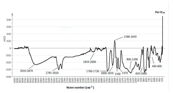 Table 3 shows the interrelation between the wave number from the FTIR spectra, considered as the x-variable, and the AGI activity (per IC50), considered as the y-variable. The plot exhibits the spectral data that influence the AGI activity. The peaks present at the negative axis of pq [1] of the plot correlate with the AGI activity and vice versa. The peaks found at 3010–3670 cm−1 and 2795–3010 cm−1, relating to the signals from the alpha-glucosidase inhibitors, showed bond stretch frequencies for O-H and C-H, respectively. These peaks indicate the presence of alcohol, alkanes, alkenes, aromatics, or aldehydes. Besides this, the peaks at 2000–1650 cm−1, 1700–1730 cm−1, and 1600–1650 cm−1 indicate C-H (bending), bond stretch frequencies for C=O, and bond stretch frequencies for C=C, respectively, which show the presence of aromatic compounds, carboxylic acid, and alkenes. Furthermore, the peaks found at 1450 cm−1 and 900–1300 cm−1 showed the presence of C-H bending and C-O (stretch) of secondary aromatic amines, an alkane, and alcohol, and ethers, esters, a carboxylic acid, and anhydrides, respectively. The presence of N-H bending was due to the appearance of a peak in the 1550 cm−1 region. Additionally, the peaks found at 650–1000 cm−1 and 430–800 cm−1 show C=C (bending) and a long chain of C-H (out-of-plane bending), respectively.