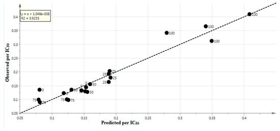 From the obtained data shown in Figure 4, it can be concluded that the validity of the model developed is appropriate, because the total sum of the squares intercepting the Y-value and the predictive ability of the model intercepting the Y-value were less than 0.4 and 0.05, respectively [29]. In the present study, both of the model’s intercepting Y-values met the specifications. Its residuals were linear with an R2 of 0.9255, which represents the match between the experimental data and the model’s predictions (Figure 5).