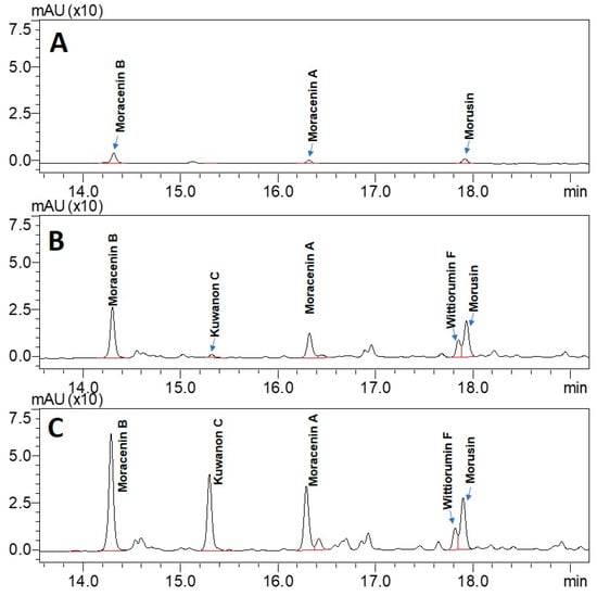 | Morusin | Kuwanon C | Moracenin B (reference) | Moracenin A | Wittiorumin F |