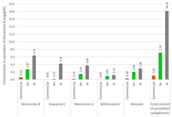 | N- extract containing a 20.8 µM equivalent prenylated compounds (N-, 1.37%) (Moracenin B: 6 µM, Kuwanone C: 6.7 µM, Morusin: 4 µM, Moracenin A: 4.1 µM) | 27% | 73% | |