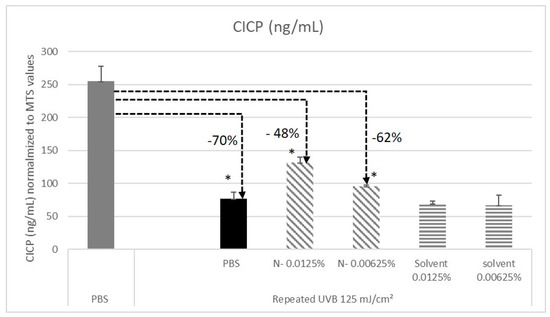 2.6. N- Extract Protects Human Fibroblasts against UV-B-Induced Decline Procollagen Type I C Propeptide (CICP) Production