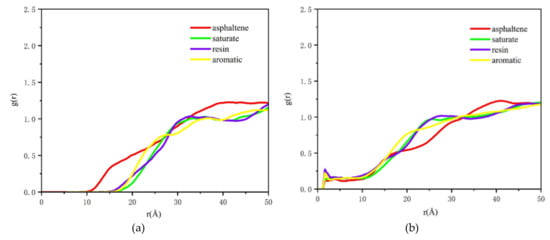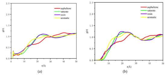 For further characterization of the variations of molecular structures of asphalt components near aggregates, the RDF of saturates, aromatics, resins, and asphaltenes (SARA) was extracted according to trajectories. Asphalt component RDFs were evaluated for 200 ps under constant volume and temperature (NVT) ensemble and the obtained results are shown in Figure 1a,b and Figure 2a,b.
