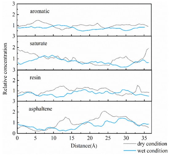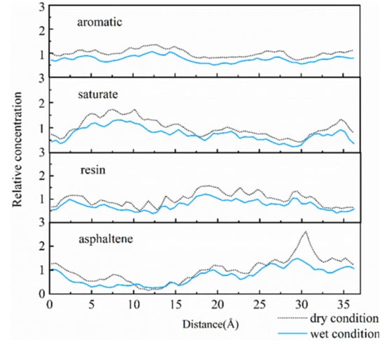 In Figure 2b, due to the moisture effect on the asphalt-water-albite interface, the peak value of g (r) of resin at 24 Å was decreased from 1.21 (dry condition) to 1.13, and the peak values of all curves were declined. Under wet conditions, the peak values and curve trends of saturate and resin were similar after 14 Å, and the peak value of asphaltene at 40 Å was slightly higher than that in arid condition at 40 Å, which could be due to the powerful polarity of water and asphaltene.