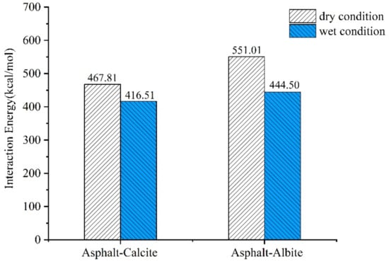 Asphalt-aggregate adhesion works are presented in Figure 5. Under the dry condition, the adhesion works of asphalt-calcite and asphalt-albite interfaces were found to be 467.81 and 551.01 kcal/mol respectively, which were slightly higher than that of the asphalt-calcite system. The reason for this was that, although the acidic mineral albite (Na2O·Al2O3·6SiO2) had higher SiO2 content, which had less contribution to adhesion work [24,25], it contained Na+, which had more powerful polarization ability than Ca2+. Due to the strong electrostatic attraction of Na+ toward asphaltene and resin with strong polarity in asphalt, asphalt-albite interface adhesion work was significantly increased. After moisture intruded into the asphalt-aggregate interface, asphalt-calcite adhesion work was reduced to 416.51 kcal/mol and its ∆W value was 11.0%. However, asphalt-albite adhesion work was decreased to 444.50 kcal/mol with a ∆W value of 19.3%. Moisture decreased the debonding abilities of aggregate and asphalt and the adhesion work of acid mineral albite was attenuated the most. The reason for this was that albite contained several silica which had powerful polarization ability toward water.