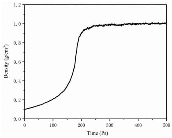In this study, Materials Studio (MS), an Accelrys’ commercial software, has been applied to support all model constructions and simulations. Simulation results obtained from the condensed-phase optimized molecular potentials for atomistic simulation studies (COMPASS) forcefield was consistent with actual measurements. Thus, the COMPASS forcefield was employed for describing potential energies and molecular interactions. Forcite module was employed for the optimization of the structure and energy of 12-component asphalt models. Then, the Amorphous cell tool was employed to construct an asphalt binder model using molecules. The initial density of the asphalt model was considered to be 0.1 g/cm3 to obtain a desirable structure with low atomic overlap. Afterwards, MD simulations were conducted with isothermal-isobaric (NPT) ensemble for 500 ps at 1 atm and 298 K with 1 fs time step. An Andersen barostat and Nose-Hoover thermostat were applied to control constant pressure and temperature, respectively. During the 500 ps NPT simulation, the density of the asphalt binder model reached a plateau after 300 ps, as shown in Figure 7. The assumed model was validated for asphalt using reports in previous literature [13,28,29].