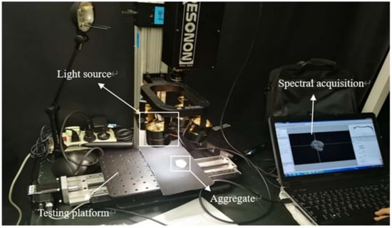 Because of nearly continuous spectral information, hyperspectral images are widely applied in mineral investigations [30,31]. Therefore, hyperspectral image technology was used for the detection of the surface compositions of limestone and granite minerals [32,33]. The first step was to record hyperspectral images through a Pika XC2 hyperspectral imager, as seen in Figure 8. Then, the acquired images were imported into Environment for Visualizing Images (ENVI) platform. Hyperspectral images have huge data volumes, making data processing very complex. Therefore, the Minimum Noise Fraction (MNF) rotation tool [34] was applied to separate reliable estimations and random noises of data dimensionality in signal information. Then, the Pure Pixel Index (PPI) tool [35] was employed to extract end members in MNF images. Moreover, spectral mixing space n-dimensional visualization [36], which is an interaction method in image classification, was used for the extraction of the purest pixel spectrum. In addition, mineral standard spectral library files were selected as a contrast spectral library when determining the surface components of aggregates through spectral analyses. The spectral angle mapper (SAM) algorithm is the measurement of similarity between image spectral and reference spectral by the calculation of spectral angle between two vectors. Meanwhile, the spectral feature fittings (SFF) algorithm is the elimination of absorption features between reference spectral and each image spectral and cut-off of each original image pixel spectrum and continuum curve. The SAM and SFF algorithm were applied for the comparison of image spectrum and standard spectrum and to identify mineral components on aggregate surface.