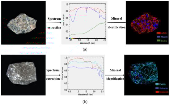 Hyperspectral identification of mineral components. (a) Mineral surface compositions of granite, (b) mineral surface compositions of limestone.