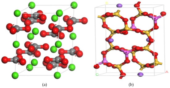 Aggregate cells of calcite and albite minerals (carbon: grey, calcium: green, oxygen: red, silica: orange, sodium: purple, aluminum: pink). (a) Calcite cell, (b) Albite cell.