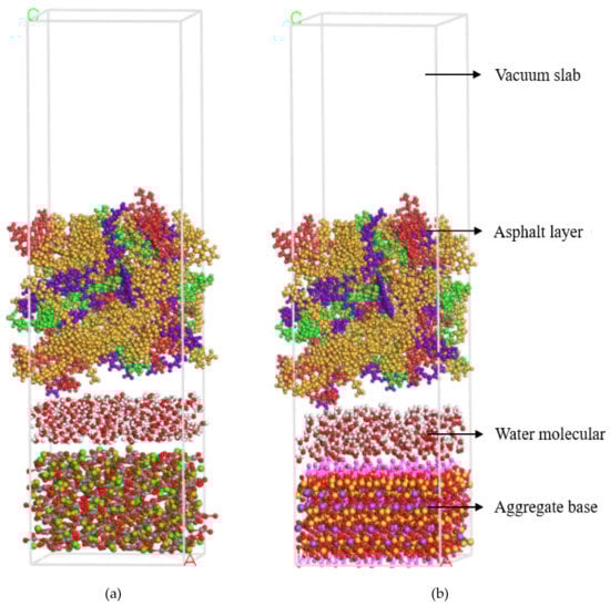 Moisture intrusion into the asphalt-aggregate interface could damage adhesion, which is the main consequence of water damage in asphalt mixtures. Therefore, asphalt-water-aggregate interface models were developed to study water’s effect on moisture damage resistance. The modeling method of these interfaces was similar to that under dry conditions. Then, 300 water molecules were added to the asphalt-aggregate interface to simulate the water intrusion effect. Optimized asphalt-water-calcite and asphalt-water-albite models are shown in Figure 12a,b.