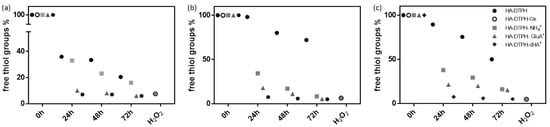Adding either dHA+, GluA+ or NH4+ to HA-DTPH polymerization mixture under argon atmosphere significantly facilitated the disulfide bond formation. Hydrogels based on HA-DTPH with varying degrees of thiolation and one of the respective ionic cross-linkers are prepared with a 1:1 ratio of ionic cross-linker to un-functionalized carboxy groups of the respective HA-DTPH. Subsequently, an Ellman’s assay is performed over time. For HA-DTPH29% without an ionic cross-linker (Figure 2a), the measured free thiol amount decreased from 100% free thiol groups to 36 ± 0.08% within 24 h, whereas for HA-DTPH29%-NH4+, a decrease from 100% to 33 ± 0.03%, for HA-DTPH29%-GluA+ from 100% to 10% ± 0.02 and for HA-DTPH29%-dHA+ from 100% to 7 ± 0.02% was observed. The same trend is seen for HA-DTPH42% (Figure 2b) and HA-DTPH58% (Figure 2c) with and without the cross-linker, respectively.