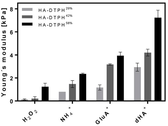 The tunability of the stiffness was also proven to be achievable by varying the concentration of the used ionic cross-linker dHA+ at a constant degree of thiolation of HA-DTPH. Increasing the ionic cross-linker dHA+ concentration resulted in an increased Young’s modulus (Table 1).