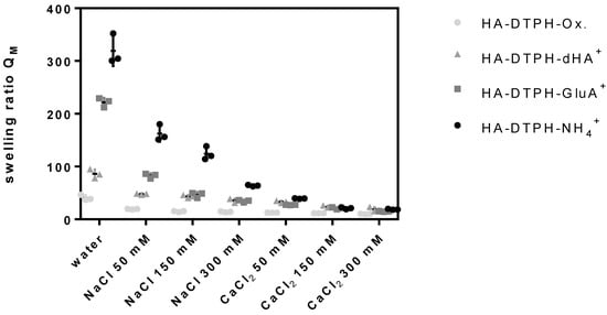 The swelling ratio of HA-DTPH-Cl+ hydrogels and HA-DTPH-Ox. hydrogels significantly depends on the degree of thiolation, the type of the cross-linker and the ionic strength of the solution. HA-DTPH-Ox. show the lowest swelling ratios compared to HA-DTPH-Cl+ hydrogels. For HA-DTPH-Cl+, a clear trend of the swelling behavior is observed. Swelling ratio is increasing from dHA+ and GluA+ to NH4+. A common trend for each hydrogel system is the decreased swelling ratio with increasing ionic concentration. This accounts for all ions tested. The second trend is the decreasing swelling ratio from NaCl to CaCl2. The lowest swelling ratio was determined for hydrogels incubated with CaCl2. The third feature is the decreased swelling ratio with increasing thiolation degree (Figure 4) (see Figure A1 of Appendix A).