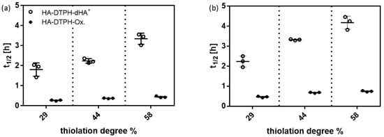 In vitro, degradation rates of the HA-DTPH-dHA+ hydrogels and HA-DTPH-Ox. hydrogels were found by incubating hydrogels with two different enzymes, namely hyaluronidase and hyaluronate lyase, at concentrations of 100 U/mL in PBS, to ensure complete gel degradation before hyaluronidase IV inactivation []. The half-time t1/2 of hydrogels defines the time at which the weight of the gel is reduced to half the initial weight and were calculated from the initial linear slope of gel mass vs. time plots. Significant differences were measured in the degradation rates comparing HA-DTPH-Ox. and HA-DTPH-dHA+. HA-DTPH-Ox. hydrogels have shorter half-lives than comparable HA-DTPH-dHA+ made with the same HA-DTPH (Figure 5). Half-lives for hyaluronate lyase (Figure 5a) are shorter with 1.8 ± 0.3 h for HA-DTPH29%-dHA+ to 0.3 ± 0.03 for HA-DTPH29%-Ox. For hyaluronidase IV (Figure 5b), half-lives range from 2.2 ± 0.3 h for HA-DTPH29%-dHA+ to 0.5 ± 0.03 h for HA-DTPH29%-Ox. hydrogel. No significant change in mass was observed in the negative-control for HA-DTPH-dHA+ hydrogels and HA-DTPH-Ox. hydrogels, which were incubated in PBS buffer alone. Long-term stability measurements were performed over six months in PBS and HA-DTPH-dHA+ hydrogels were weighed each week, which showed a weight loss of less than 10% after six months (data not shown).