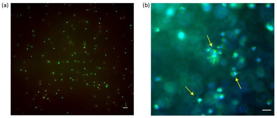 Normal human dermal fibroblasts (NHDF) in HA-DTPH58%-dHA+ hydrogel. (a) Live/Dead staining of NHDF embedded in HA-DTPH58%-dHA+. Homogenous distribution of NHDF cells inside the hydrogel. Living cell (green fluorescence) and dead cell (red florescence). Image was taken as a Z-stack and max. intensity was performed via ImageJ. Scale bar = 50 µm (b) Composite images taken from NHDF embedded in HA-DTPH58%-dHA+−5% RGD hydrogel. Spreading of fibroblasts (indicated with yellow arrows) was observed 24 h post-embedding inside the hydrogel. Cell nuclei are stained with DAPI. Actin is directly stained with phalloidin. Scale bar = 50 µm.