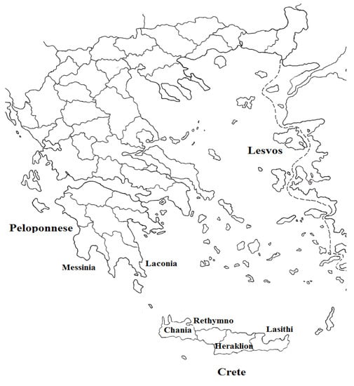 In this study, we investigated the classification of olive oil samples using optical spectra for various spectral regions from ultraviolet (UV) to near-Infrared (NIR), and also fluorescence and Raman spectroscopic data. Seventy-one samples of Greek olive oils were collected in the winter period of 2018–2019 from three regions of Greece, namely Crete, Peloponnese and Lesvos. These included 40 samples of Koroneiki variety produced in different subareas (prefectures) of Crete (16 from Heraklion, 7 from Lasithi, 8 from Rethymnon and 9 from Chania), 16 samples of Koroneiki and Kolovi varieties produced in different subareas (prefectures) of Peloponnese (12 from Messinia and 4 from Laconia) and 15 samples of Koroneiki, Kolovi and Adramitiani varieties from Lesvos. A map of the above-mentioned regions is shown in Figure 1.