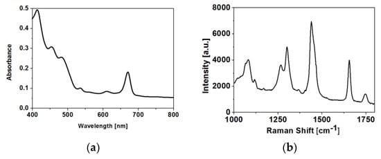A typical visible absorption spectrum of olive oil is shown in Figure 2a. Samples of olive oil present peaks from carotenoids at 454 and 480 nm, while peaks at 416 and 670 nm correspond to chlorophyll []. A typical Raman spectrum of olive oil from 1000 to 1800 cm−1 is shown in Figure 2b. The characteristic Raman bands correspond to the vibrations of fatty acids in olive oils. In particular, the band at 1082 cm−1 is due to C-C stretching vibrations, and the one at 1265 cm−1 is due to =C-H stretching vibrations. The bending vibrations of C-H is observed at 1300 and 1441 cm−1, while C=C stretching of unsaturated fatty acids is observed at 1657 cm−1. A weak band at 1747 cm−1 corresponds to C=O stretching of esters in olive oil [,,,].
