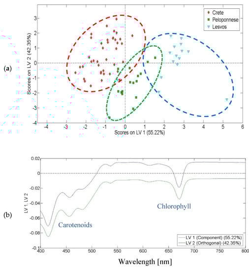 The application of PLS-DA on the visible spectra brought on a clear separation of the olive oils produced in different geographical regions as shown in the score plot of Figure 3a. In total, 97.57% of data variance was explained by the first two latent variables (LV1 and LV2). The loading plot of Figure 3b depicts that both the first and the second latent variable played a notable role in the discrimination of the olive oils based on their geographical origin. Four main bands contributed to the discrimination, namely at 454 and 480 nm, that correspond to carotenoids, and at 416 and 670 nm, that correspond to chlorophyll. Therefore, chlorophyll and carotenoid contents are different in olive oils produced in different regions of Greece []. As mentioned by Mateos et al., differences in chlorophyll and carotenoid contents depend on the growing regions of the olive oils [].