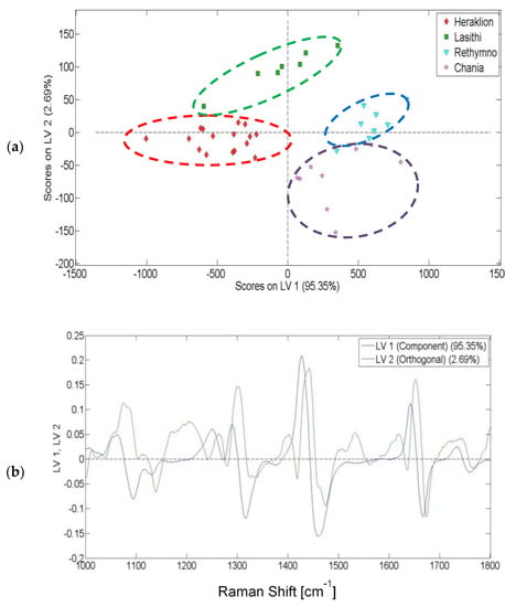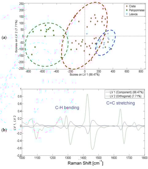 Classification of olive oils: (a) score plot for the discrimination of the olive oils from Crete using Raman spectroscopy; (b) loading plot based on Raman spectra.