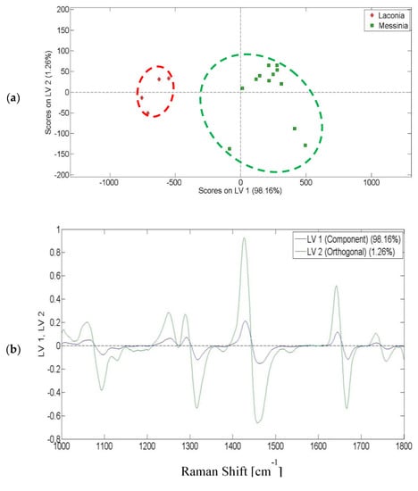 Classification of olive oils: (a) score plot for the discrimination of the olive oils from Peloponnese using Raman spectroscopy; (b) loading plot based on Raman spectra.
