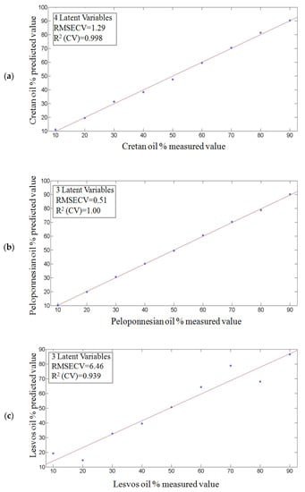 Figure 7 presents the measured concentrations versus the predicted concentrations resulting from the application of PLS on the visible absorption spectral data. Figure 7a corresponds to the mixture of olive oils from Crete and Peloponnese and has a correlation coefficient of 0.998 and a RMSECV of 1.29. Figure 7b shows the mixture of olive oils from Peloponnese and Lesvos and has a correlation coefficient of ≈1.000 and a RMSECV of 0.51. Figure 7c depicts the mixture of olive oils from Crete and Lesvos and has a correlation coefficient of 0.939 and a root mean square error of cross-validation of 6.46.