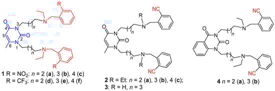 Synthesis of initial compounds 1,3-bis(4-bromobutyl)-6-methyluracil (7a), 1,3-bis(5-bromopentyl)-6-methyluracil (7b), 1,3-bis(6-bromohexyl)-6-methyluracil (7c) [], 1,3-bis(4-ethylaminobutyl)-6-methyluracil (8a), 1,3-bis(5-ethylaminopentyl)-6-methyluracil (8b), 1,3-bis(6-ethylaminohexyl)-6-methyluracil (8c) [,], 1,3-bis(5-azidopentyl)-6-methyluracil (11) [], and 1,3-bis(5-bromopentyl)quinazoline-2,4-dione (9b) was carried out as previously reported [].