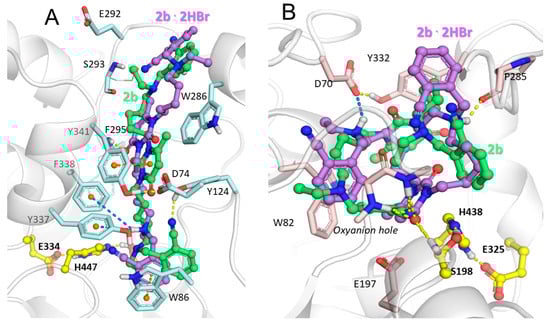 Influence of quaternization of the aliphatic N atoms, replacement of 6-methyluracil moiety with quinazoline-2,4-dione and polymethylene chains’ length of nitriles obtained on interactions with hAChE gorge, was assessed by molecular docking. Positions with the best binding affinities (see Table S1 in Supplementary Materials are discussed below. The position of the nitrile 2b binding in the active site gorge of hAChE obtained by molecular docking is very close to that of its nitro group-containing analog 1b, as observed by X-ray crystallography []. The inhibitor molecule spans through the whole gorge and occupies both the PAS and active site (Figure 2A). The 20 Å-long hAChE gorge leading from the enzyme surface to the catalytic triad (S203–H447–E334) is divided in the middle with a so-called bottleneck (formed by Y341, Y337, and Y124) into the peripheral anionic site and the active site []; the inhibitor occupies both of these sites.