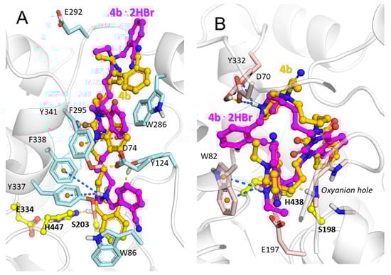 Binding poses of quinazoline-2,4-dione 4b (carbon atoms are shown gold) and its charged counterpart 4b·2HBr (carbon atoms are shown in magenta) inside active site gorges of (A) hAChE and (B) hBChE. Yellow, dashed lines represent hydrogen bonds, orange represents π–π stacking interactions, and blue lines are ionic and π–cation interactions. The catalytic triads of the enzymes are shown with yellow carbon atoms.