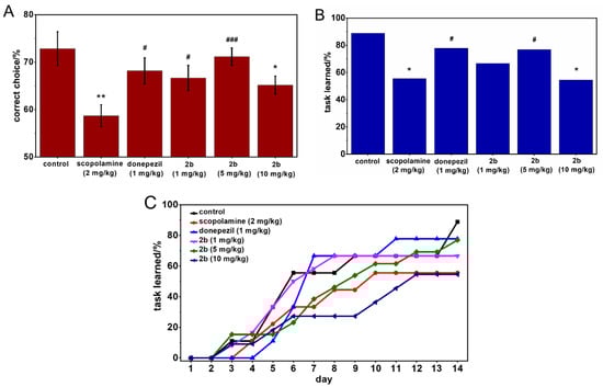 The reward alternation task using T-maze was performed to evaluate whether compound 2b could attenuate the cognitive deficits in scopolamine-treated mice. Mice were treated with scopolamine and tested compounds 40 and 20 min before T-maze test, respectively. The percentage of correct choices, percentage of mice reaching the criterion of learning, and dynamic of reaching the criterion of learning were evaluated. Scopolamine-injected mice showed significant impairment of spatial memory in a T-maze, which was characterized by decreases in percentages of both correct choice and reaching the learning criterion at day 14. This memory deficit was rescued, to some extent, by treatment with either compound 2b (1 and 5 mg/kg) or donepezil (1 mg/kg). The most effective rescue of memory impairment, as shown by restoration of correct choice and reaching the learning criterion at day 14, was found in the case of treatment with compound 2b at a dose of 5 mg/kg, with other doses being less effective. Notably, a higher dose of compound 2b (10 mg/kg) produced less therapeutic effects in terms of spatial memory deficit. Apparently, this decrease in the effectiveness of the higher dose of compound 2b could be associated with cholinergic side effects, such as gastrointestinal upset, interfering with task learning during behavioral tests []. However, 5 mg/kg nitrile 2b showed the same efficacy as donepezil (1 mg/kg) in the rescue of spatial memory deficit in scopolamine-injected mice (p > 0.05) (Figure 5A–C). Scopolamine-treated mice had decline in dynamic of reaching the criterion of learning. In contrast, mice treated with nitrile 2b (1 and 5 mg/kg), similar to donepezil-treated mice, showed a progressively increased trend of learning, comparable to the control group (Figure 5C).