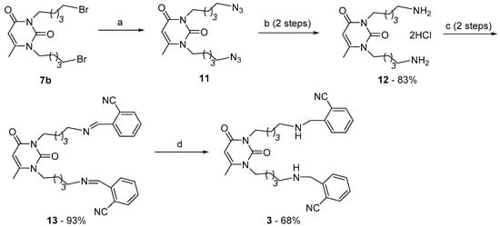 Contrarily, for the synthesis of compound 3 with secondary amino group in pentamethylene chains a different approach was used. It was evident that compound 3 had to be prepared starting from uracil derivative with terminal primary amino groups in chains at pyrimidine N atoms. Attempt of direct substitution of Br in dibromide 5b by NH2 in ammonia solution was unsuccessful. Then dibromide 5b was converted to azide 11 [] and the Staudinger reaction [] of the azide with triphenylphosphine gave bisamine 12. The aimed secondary bisamine 3 was prepared reacting 12 with 2-nitrilebenzaldehyde and reducing intermediate aldoimine 13 with NaBH4 (Scheme 3). It is worth noting that direct alkylation of bisamine 12 with o-nitrilebenzyl bromide produced not compound 3 but compound with fully alkylated amino-groups.