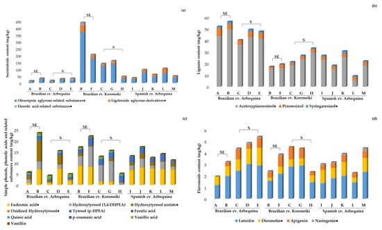 Overall, in the present study, secoiridoids were the most prevalent sub-class of phenolic compounds, followed by lignans, simple phenols and similar substances, and flavonoids (Table S2a), which is in accordance with previous reports [37].