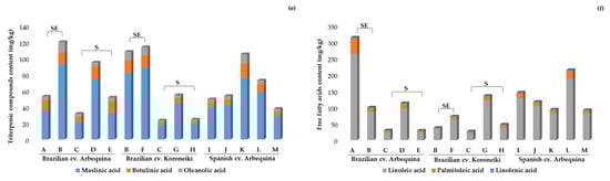 In the present study, three pentacyclic triterpenes (maslinic, betulinic, and oleanolic acids) were identified and quantified (Figure 1e; Table S2a), with the first being the predominant compound of this class in all samples. To the best of our knowledge, there are no previously published works reporting the concentrations of triterpenic acids in Brazilian EVOOs. Among the samples from Brazil, most EVOOs from the Southeast presented higher contents of such compounds (except for cv. Arbequina brand A, with 52.9 mg total triterpenic acids per kg), when compared to samples from the South. Contents of maslinic acid in EVOOs from Brazil would be equivalent to those in the group with very high or high contents of pentacyclic triterpenes among the samples from the World Olive Germplasm Bank Collection of Cordoba (Spain) established by Allouche et al. [47]. These authors carried out a comprehensive study evaluating the triterpenic dialcohol and acid composition of oils from 40 cultivars, and divided them into five groups according to their content (as betulinic acid equivalents). They primarily assigned the differences in triterpenoids content to genetic factors. However, when oleanolic acid is considered, Brazilian EVOOs would be placed in the low content group. Oleanolic acid concentrations varied from 2.03 to 12.6 mg/kg in a Koroneiki sample and in one Arbequina EVOO from Brazil, respectively.