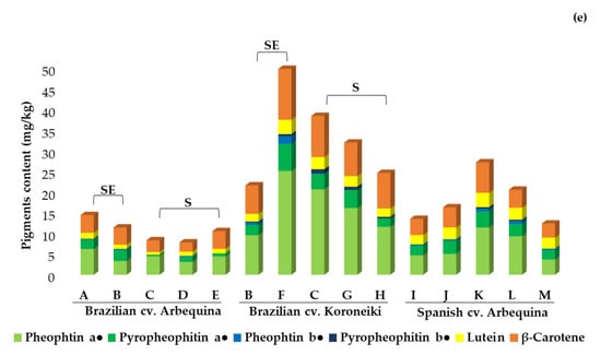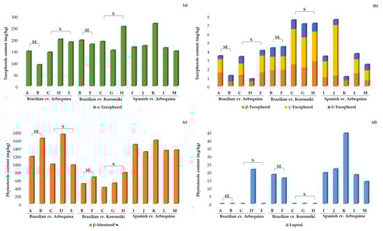 Tocopherols, phytosterols, and pigments profiles (mg/kg) of the studied EVOOs determined by NP-LC-DAD/FLD (sample identification in Table 3): (a) α-tocopherol; (b) ββ-, γ-, and δ-tocopherols; (c) phytosterols: *β-sitosterol, coeluted with other free sterols; (d) lupeol; and (e) pigments. SE, Oils from the Southeast. S, Oils from the South. ● Compounds quantified in mg of homologous substance/kg, as shown in Table S5b.