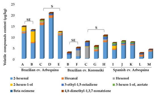 The single identified ester was 3-hexen-1-ol acetate, which was detected in samples from the South of Brazil (except for samples D and E from cv. Arbequina) and in three of the five Spanish samples. This ester is also derived from the lipoxygenase pathway, where acetyl-CoA derivatives suffer from the action of alcohol acyltransferase to form acetate esters, which contribute to aroma notes of banana and walnut husk [54,62].