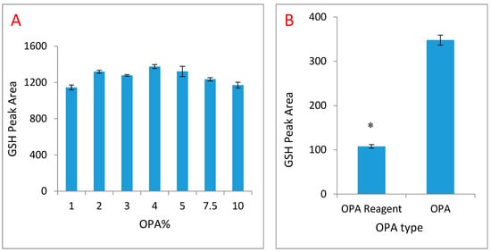 (A) Summary figure of the optimisation of glutathione-O-pthaldialdehyde (OPA) concentration using a 2000μM reduced glutathione (GSH) standard. (B) Reactivity of OPA and OPA reagent with 400 μM GSH standard. Data are presented as mean ± (standard error of mean (SEM) (n = 5, * p < 0.05). Standards prepared using N-ethylmaleimide (NEM) and incubated for up to 10 min and assayed by high performance liquid chromatography (HPLC). Peak areas at a wavelength of 450 nm were measured.