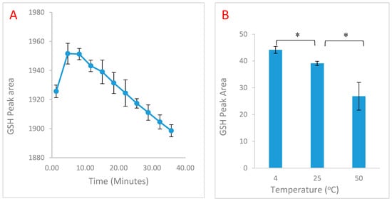 (A) Optimal incubation time required of 4 mM reduced glutathione (GSH) with 5% O-pthaldialdehyde (OPA) and subsequent degradation. (B) 200μM GSH run at different assay temperatures. Data are presented as mean ± standard error of mean (SEM) (n = 5, * p < 0.05).