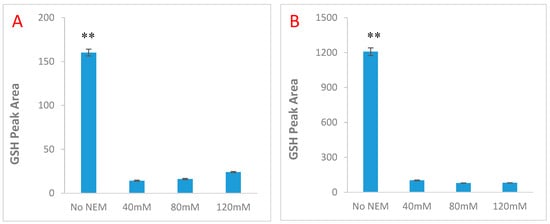 N-ethylmaleimide (NEM) optimisation using different amount of GSH (A) 200 μM (B) 2000 μM. The results also showed that 10–15% of GSH is oxidised to GSSG. Data are presented as mean ± SEM (n = 5, ** p < 0.05).