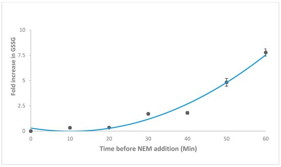 Time dependent auto-oxidation of reduced glutathione (GSH) with fold increase in oxidised glutathione (GSSG). 200 uM GSH was subjected to GSSG assay protocol at different incubation times. Samples were incubated at 4 °C for varying times, 40 mM NEM was added and incubated with O-pthaldialdehyde (OPA) for 25 min. Data are presented as mean ± SEM (n = 3).