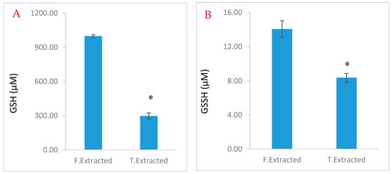 Degradation of blood and serum reduced glutathione (GSH) through different extraction procedures. T extract: Freshly harvested whole blood of serum was snap frozen in liquid nitrogen and stored at −80 °C for 6 weeks. On the day of the experiment, PCA was added to the frozen sample and allowed to thaw, thus extraction and thawing occurred simultaneously; F-extract: freshly harvested whole blood of serum was subjected to PCA extraction and the supernatant stored at −80 °C for 6 weeks. On the day of the experiment, the supernatant was thawed and used for the assay. (A) was subjected through GSH protocol; (B) was subjected through GSSG protocol. Data are presented as mean ± SEM (n = 4, * p < 0.05). Data are presented as mean ± SEM (n = 4).