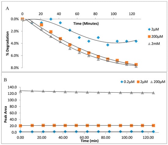 (A,B): Stability of glutathione-OPA adduct. The time-dependent (over 120 min) degradation at 40 °C of reduced glutathione (GSH) (A) and oxidised glutathione (GSSG) (B) after derivatisation at three concentrations: 2 μm, 200 μm and 2 mM (A). Data are presented as means (n = 2).