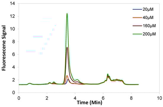The limit of detection (LOD: lowest amount detectable but not necessarily quantifiable) and the limit of quantification (LOQ: lowest amount quantitatively detectable with precision and accuracy) were calculated to be 0.34 µM and 1.14 µM respectively from the regression equation. Both LOD and LOQ were tested and verified experimentally. The LOD and LOQ of GSSG method was found to be 0.26 µM and 0.88 µM respectively. Overlapping chromatograms (Figure 9) of GSH standards further supports that the optimised method has satisfactory specificity with asymmetry factors of 0.821 (20 µM). Five liver samples (≈200 mg each) were spiked with either 50, 100, 200, 300, or 400 µM GSH prior to extraction. The total GSH of the extract increased linearly (Figure 10; r2 = 0.99, R = 1) with spiked GSH concentration showing consistent recovery of the extraction procedure.