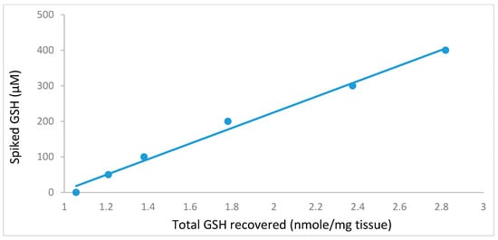 The total reduced glutathione (GSH) recovered from 200 mg of liver tissue spiked with GSH (0–400 μM) prior to extraction (n = 3).