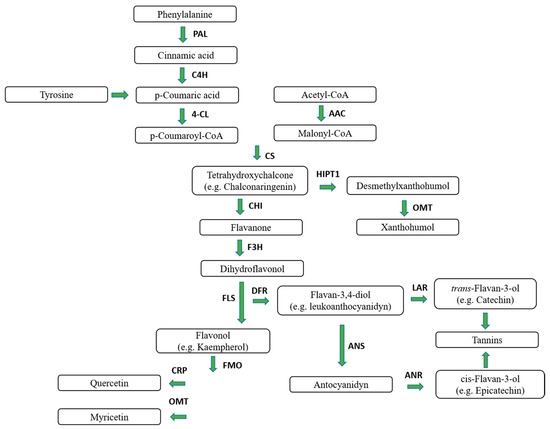 Biosynthesis pathways of several hop flavonoids. PAL: Phenylalanine ammonia-lyase; C4H cinnamate 4-hydroxylase, 4CL 4-coumarate-CoA ligase, AAC acetyl-CoA carboxylase, CS chalcone synthase, HIPT1 Humulus lupulus prenyltansferase-1,CHI chalcone isomerase, OMT O-methyltransferase, F3H flavanone 3-hydroxylase, FLS flavonol synthase, DFR dihydroflavonol 4-reductase, LAR leucoanthocyanidin reductase, ANS anthocyanidin synthase, ANR anthocyanidin reductase, FMO flavonoid 3-monooxygenase, CPR cytochrome P450 reductase, F3′5′H flavonoid 3′5′-hydroxylase.