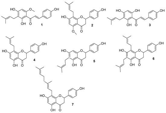 Flavonoids are phenolic derivatives with a flavan or chalcone flavonoid skeleton and have many beneficial effects on human health [7,8]. This is especially true of prenylflavonoids, which have so far been identified in 37 of plant genera, mainly in the families of Leguminosae, Moraceae, Guttiferae, Umbelliferae, Rutaceae and Cannabaceae [9].