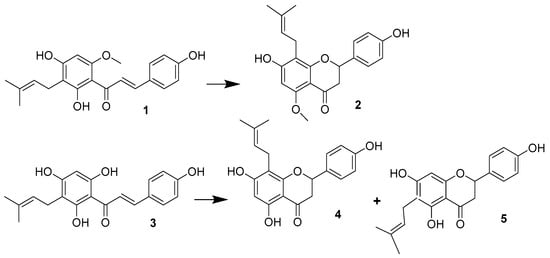 Prenylated flavonoids are accumulated in lupulin glands that cover bract of female hop cones. Their common precursor compound xanthohumol (XN) (1) (Figure 2), a prenylated chalcone, is the principal prenylflavonoid in the female flowers of the hop plant Humulus lupulus L. and provides 80–90% of its total flavonoid content [11].