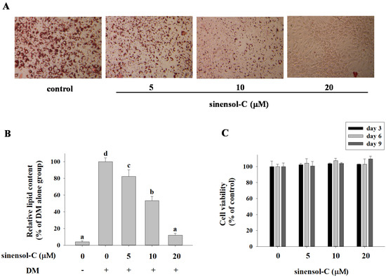 Effect of sinensol-C on intracellular lipid accumulation at day 9 in 3T3-L1 adipocytes. (A) Effects of sinensol-C on lipid droplet formation in 3T3-L1 adipocytes assessed by Oil Red O staining and visualized under light microscopy. (B) Relative lipid content of each sample determined by quantitative analysis of Oil Red O content. 3T3-L1 cells differentiated with differentiation media in the absence or presence of sinensol-C for 9 days. (C) Effects of sinensol-C on cell viability in 3T3-L1 cells. Cells were incubated with different concentrations (0, 5, 10, and 20 μM) of sinensol-C for 3, 6, and 9 days. DM: differentiation medium. Data are expressed as mean ± SD of three replicates. Different letters denote significant difference (p < 0.05) between the groups.