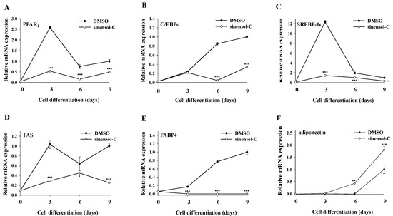 It was well demonstrated that PPARγ, C/EBPα, and SREBP-1c are critical transcription factors that regulate adipocyte differentiation and lipid production. Therefore, we examined whether sinensol-C treatment could modulate the expression of these marker genes in differentiated adipocytes. As shown in Figure 3A,C, treatment with sinensol-C significantly inhibited the mRNA expression levels of PPARγ and SREBP-1c at all differentiation periods (day 3, 6, and 9). Furthermore, sinensol-C also had a significant inhibitory effect on C/EBPα mRNA level, especially at day 6 and day 9 (Figure 3B). Next, we also evaluated the effect of sinensol-C on the expression of adipogenesis-related genes, such as FAS, FABP4, and adiponectin. As shown in Figure 3D,E, the mRNA levels of FAS and FABP4 were obviously suppressed by sinensol-C, when compared with the control group at all differentiation periods. It is notable that sinensol-C markedly enhanced the mRNA level of adiponectin, compared with the control at differentiation day 6 and 9 in 3T3-L1 adipocytes (Figure 3F).