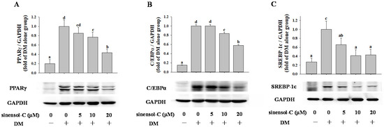 Effect of sinensol-C on the protein expression of differentiation related transcription factors (A–C). Confluent 3T3-L1 preadipocytes were differentiated into adipocytes in medium, either with or without different concentrations of sinensol-C for 9 days. DM: differentiation medium. The bands were normalized to an internal control (GAPDH), presented as the relative ratio. Data are expressed as mean ± SD of three replicates. Different letters denote significant difference (p < 0.05) between the groups.