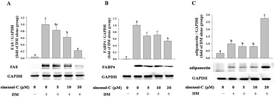 Effect of sinensol-C on the protein expression of fatty acid synthase (FAS) (A), FABP4 (B), and adiponectin (C). Confluent 3T3-L1 preadipocytes were differentiated into adipocytes in medium, either with or without different concentrations of sinensol-C for 9 days. DM: differentiation medium. The bands were normalized to an internal control (GAPDH), presented as the relative ratio. Data are expressed as mean ± SD of three replicates. Different letters denote significant difference (p < 0.05) between the groups.