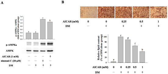 Effect of AICAR on (A) protein expression of p-AMPKα, and (B) intracellular lipid accumulation in 3T3-L1 adipocytes. 3T3-L1 cells differentiated with differentiation media in the absence or presence of AICAR for 9 days. The lipid droplet formation in 3T3-L1 adipocytes assessed by staining with Oil Red O and visualized under light microscopy. Relative lipid content of each sample determined by quantitative analysis of Oil Red O content. DM: differentiation medium. Data are expressed as mean ± SD of three replicates. Different letters denote significant difference (p < 0.05) between the groups.