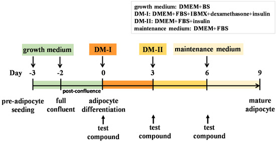 The murine pre-adipocyte cell line (3T3-L1) was purchased from the Bioresource Collection and Research Center (BCRC, Hsinchu, Taiwan). Cells were cultured in 10 cm cell culture dishes containing DMEM supplemented with 10% BS, 1 mM sodium pyruvate, and 10 mM HEPES at 37 °C in a humidified incubator containing 5% CO2. The cells were differentiated into adipocytes according to the previously described protocol with minor modification [66]. 3T3-L1 pre-adipocytes were maintained post-confluence in growth medium for 2 days. The medium was replaced by DM-I (DMEM containing 10% FBS, 10 mM HEPES, 1 mM sodium pyruvate, 0.5 mM IBMX, 1 μM dexamethasone, and 10 μg/mL insulin), and this was defined as day 0 of differentiation induction. Cells were cultured in DM-I for 3 days (from day 0 to day 3). The DM-I was then replaced with DM-II (DMEM containing 10% FBS, 10 mM HEPES, 1 mM sodium pyruvate, and 10 μg/mL insulin) for another 3 days (day 3 to day 6). Cultures were incubated for 3 days, after the DM-II was replaced with maintenance medium (DMEM containing 10% FBS, 10 mM HEPES, 1 mM sodium pyruvate) after another 3 days and the cells were cultured up to day 9. The timescale of 3T3-L1 preadipocyte differentiation is shown in Figure 8. Test compounds were dissolved in dimethyl sulfoxide (DMSO) to a final concentration of 0.1% in media. The compounds were added to the medium on day 0, and added at the time of every medium change during the 9 days of incubation.
